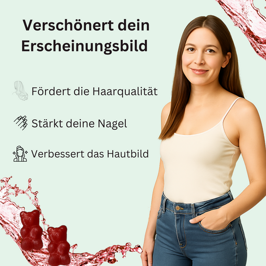 Diese Gummis sind mehr als nur lecker – sie liefern eine effektive Kombination aus Biotin, Zink und weiteren Beauty-Vitaminen. Für glänzendes Haar, klare Haut und kräftige Nägel – ganz ohne Kapseln oder Tabletten. Der fruchtige Kirschgeschmack macht die tägliche Pflege zur kleinen Belohnung. Perfekt für deine tägliche Schönheitsroutine. Natürlich, tierversuchsfrei und mit Liebe entwickelt.