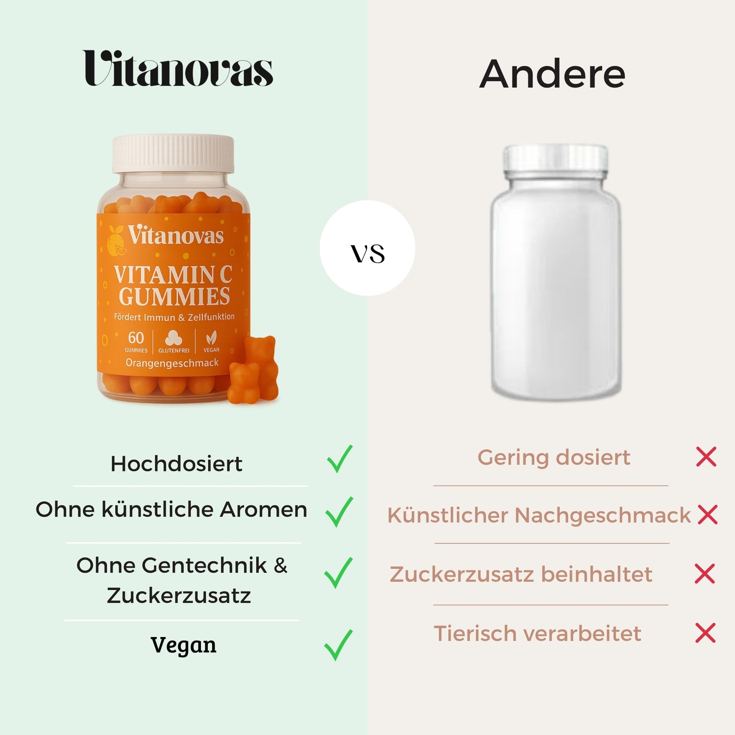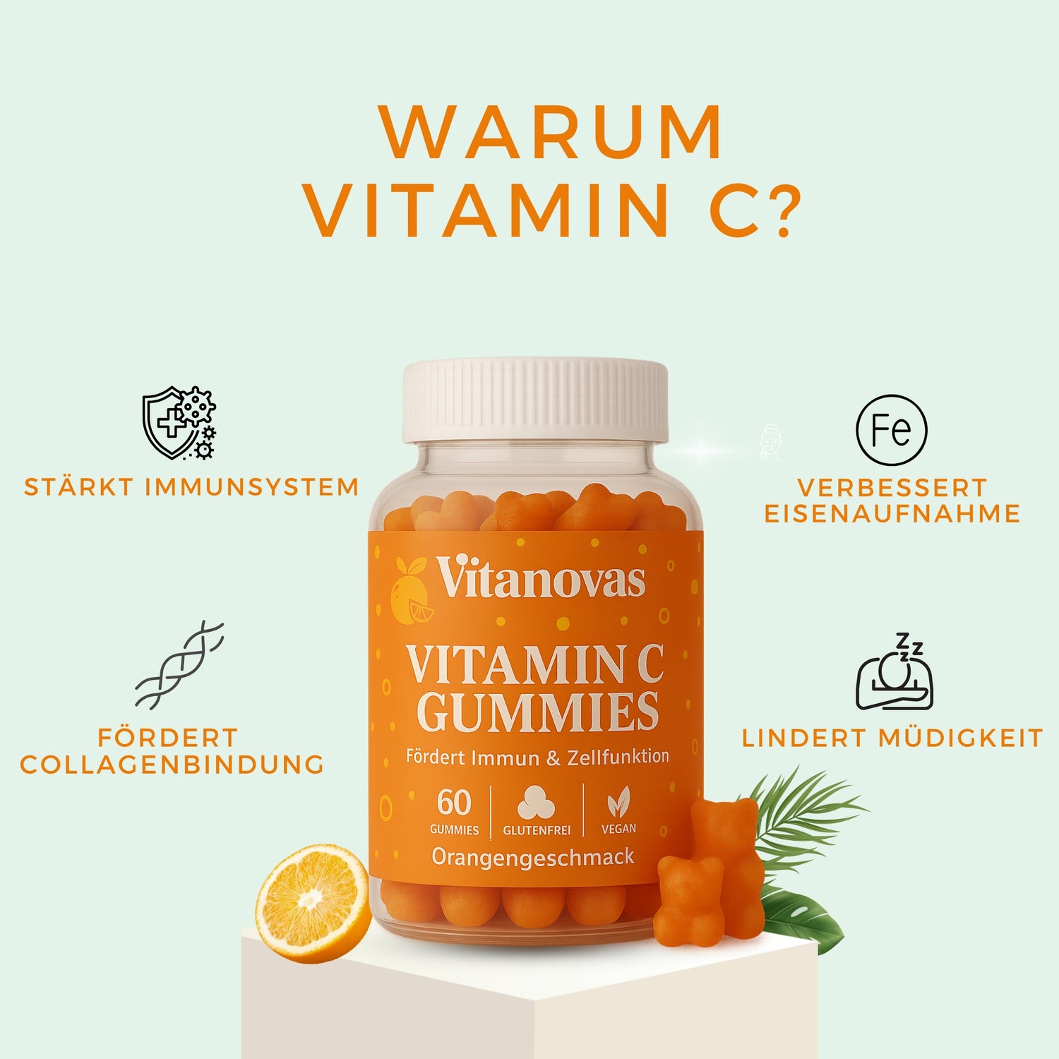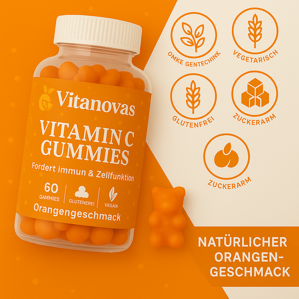 Vitanovas Vitamin C Gummibärchen stärken das Immunsystem und tragen zur Verringerung von Müdigkeit bei. Fruchtig im Geschmack, ideal für die tägliche Versorgung.